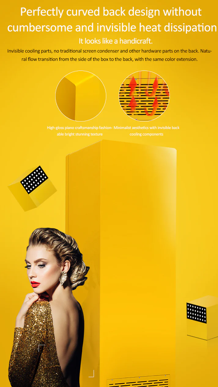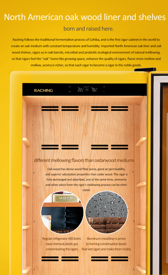 This striking yellow humidor is more than just a fashionable conversation piece - it's also the first cigar cabinet in the world to create an oak medium with constant temperature and humidity! Imported North American oak serves as both shelves and interior liner, allowing the cigars to experience the same natural benefits of barrel-fermented cigars: a mellower mouthfeel, richer aroma, deeper flavor, and higher smoke levels! The exterior boasts a classic COHIBA high-gloss yellow piano finish with sleek craftsmanship and invisible back cooling components for a minimalist touch. The smooth double-arc chamfered door sets itself apart from traditional cigar cabinet's sharp corners and edges with stylish curves that stand out by blending in. A self-contained refrigeration black box collects all of the condensation within to fully separate moisture, and the HBP compressor provides frost-free air-cooling to trap less moisture and lock in the aroma, flavor, and firm shape and beauty of your cigars! A “Geothermal” PTC thermal compensation system avoids the typical trappings of uneven humidifying by simulating home underfloor heating, allowing hot air to naturally rise and leading to a humidity variation level of less than 2% between top and bottom of the cabinet.