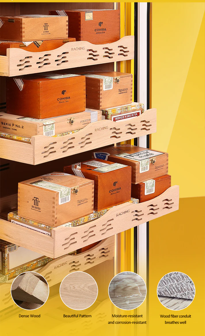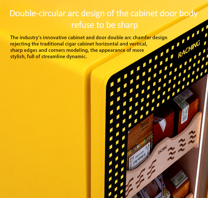 This striking yellow humidor is more than just a fashionable conversation piece - it's also the first cigar cabinet in the world to create an oak medium with constant temperature and humidity! Imported North American oak serves as both shelves and interior liner, allowing the cigars to experience the same natural benefits of barrel-fermented cigars: a mellower mouthfeel, richer aroma, deeper flavor, and higher smoke levels! The exterior presents a classic COHIBA high-gloss yellow piano finish with sleek craftsmanship and invisible back cooling components for a minimalist touch. The smooth double-arc chamfered door sets itself apart from traditional cigar cabinet's sharp corners and edges with stylish curves that stand out, while still boasting a classic wooden interior frame and invisible handle to blend in. A security lock prevents unintentional opening and protects your collection, and COB lights provide softer and more uniform lighting than LEDS while remaining highly visible to show off in style. Refrigeration fins collects all of the condensation within to fully separate moisture, and the HBP compressor provides frost-free air-cooling to trap less moisture and lock in the aroma, flavor, and firm shape and beauty of your cigars! A bottom drawer-type water tank allows for easy access for adding water, cleaning, or other routine maintenance. A “Geothermal” PTC thermal compensation system avoids the typical trappings of uneven humidifying by simulating home underfloor heating, allowing hot air to naturally rise and leading to a humidity variation level of less than 2% between top and bottom of the cabinet.