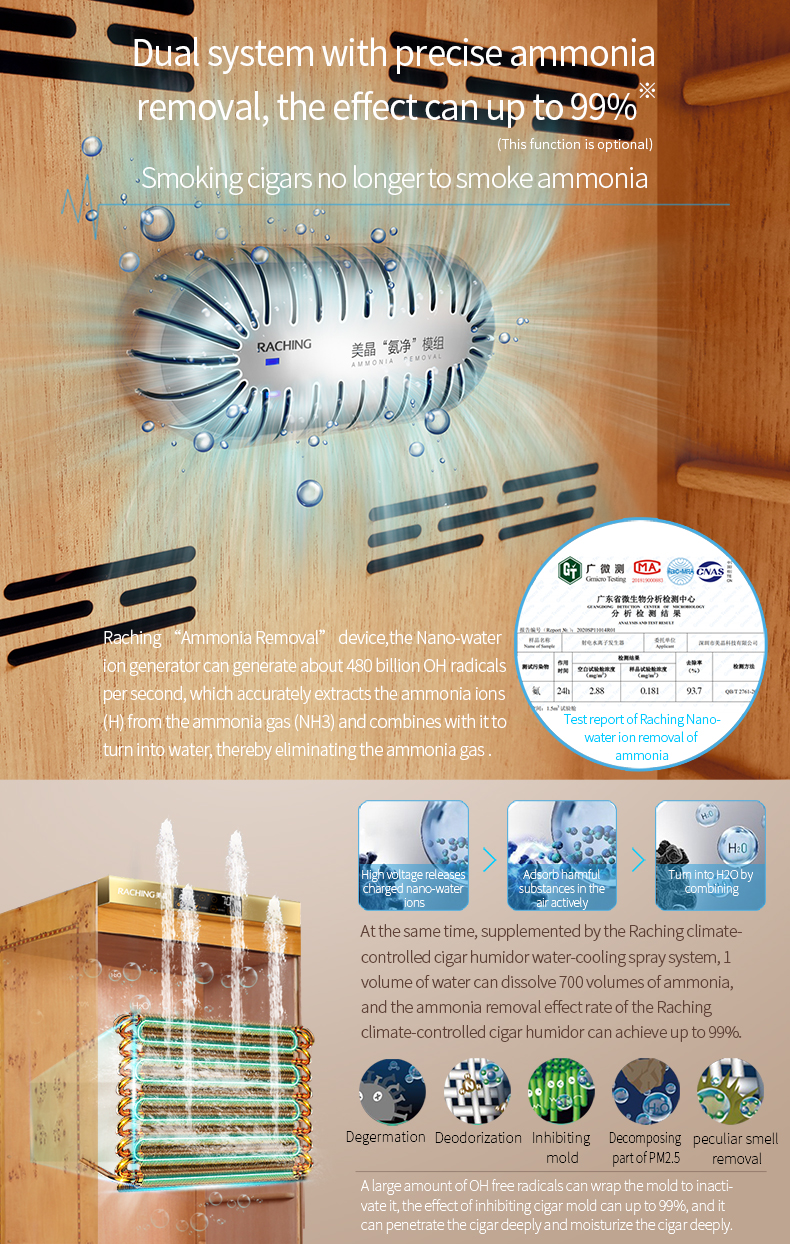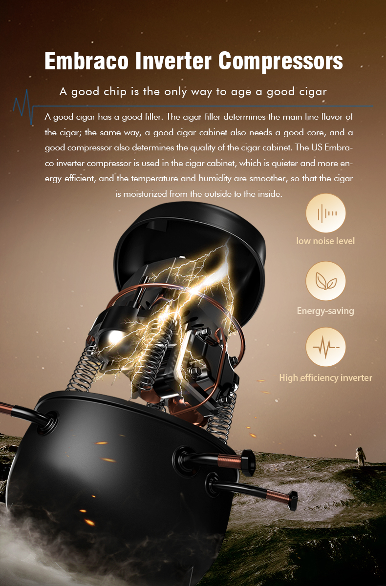 Discover the Raching MON5800A Humidor, a pinnacle of precision and sophistication in cigar storage. Since 2004, Raching has been synonymous with luxury and innovation in climate-controlled storage solutions. The MON5800A features an advanced climate control system, including built-in humidity regulation, fan cooling, heating, and de-humidification, allowing you to effortlessly maintain the ideal conditions of 70% humidity and 70°F temperature, or customize to your preference via the intuitive exterior LCD panel.